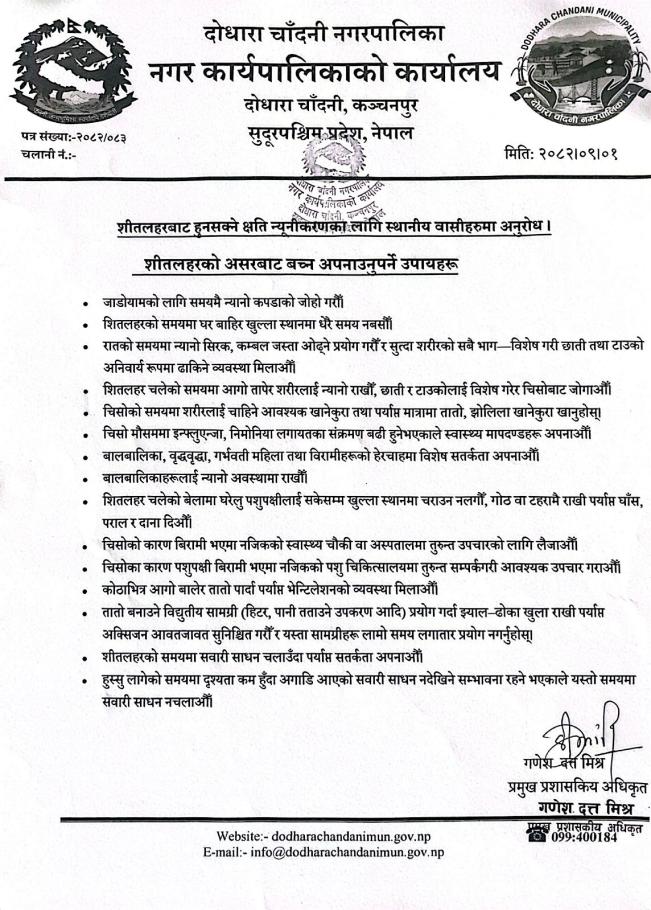 शीतलहरबाट हुनसक्ने क्षति न्यूनीकरणका लागि स्थानीय वासिहरुमा अनुरोध ।